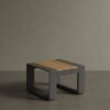 This N5 Collection Side Table features a sleek dark grey powder coated aluminium frame complemented by warm teak detailing. The juxtaposition of materials creates a striking visual contrast, blending industrial appeal with organic warmth. The table’s minimalist silhouette is defined by clean lines and an contemporary design that accentuates the natural beauty of the teak wood. The natural untreated teak’s golden-brown tones and distinctive grain patterns bring a touch of nature’s artistry to this piece.